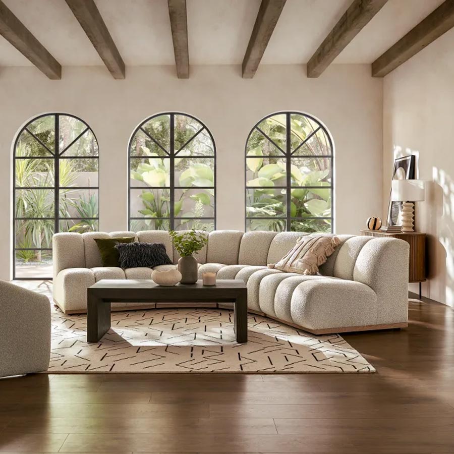 Idéal pour les petits et grandes espaces, la collection Arlo modulable respire une sophistication artistique avec sa silhouette incurvée. Son tissu bouclé résistant aux éclaboussures est un plaisir pour recevoir des invités