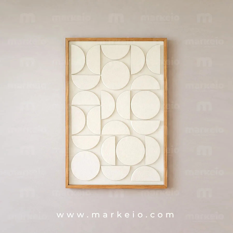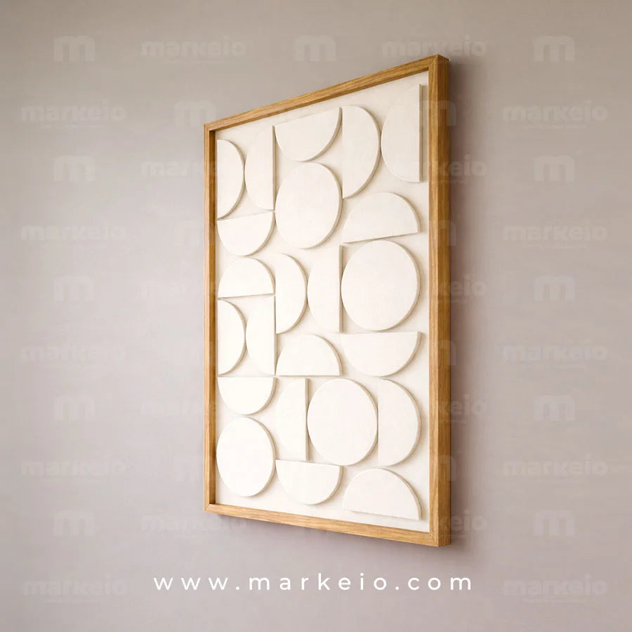 Explorez la collection d'art mural Markeio. Nos tableaux 3D, comme le modèle Halform, transforment vos murs en galeries privées. Des reliefs géométriques et des cadres en bois noble pour une décoration intérieure texturée et audacieuse partout au Maroc.